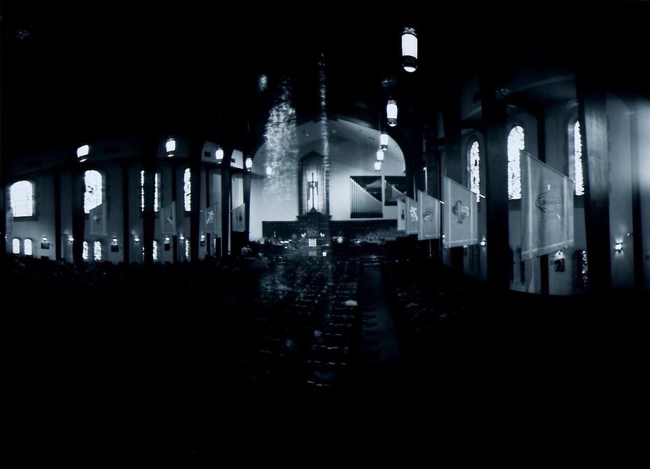 Pinhole photo of Trinity UMC in Birmingham, 2008. The camera was made from a round cookie tin, so the walls appear to curve away. Own photo.